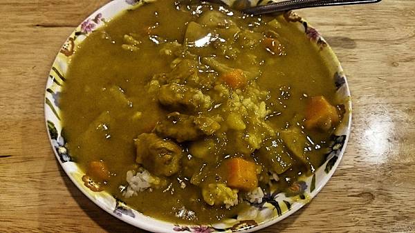日式咖哩飯,首先咖哩濃稠度很高,是我吃過的店家裡算最高的了。口味微辣,雖然名稱叫日式,但沒有日式咖哩的專有甜味,卻是走南洋風的香辛料味道。而裡頭的洋蔥沒炒爛,維持原本的口感,胡蘿蔔則沒有獨特味道,肉塊給的是豬肉,但很柴口,算是一個不小的缺點。