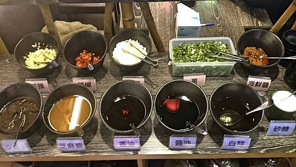 調味區,有各種調味料任人搭配,旁邊還有酸梅湯和白開水可以倒。