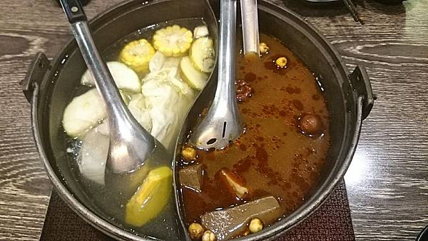 四川麻辣鍋和健康蔬果湯,這次用餐我們選了這兩個湯底,因為我一開始沒喝湯頭,所以無法做出精確味道辨認,只能說麻辣的小辣程度對不吃辣的人來講,算是普通水準。蔬果湯的話完全無感,ˊ主要被很多食材的鮮味給搞亂了,選擇了清爽湯頭就會變成這種情形,然後煮到後面階段就會變成大雜燴,我只能說吃到飽火鍋店供應的食材才是重點,除非是單人鍋。