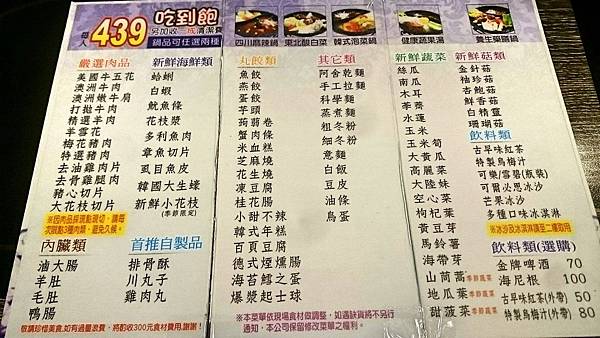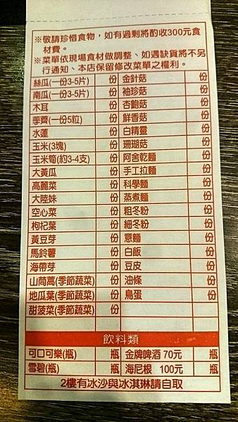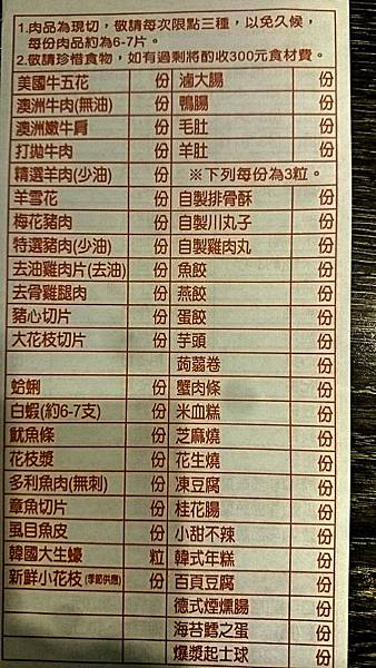 進門入座後店家會給一張彩色菜單讓人參考,上頭有好幾種湯底可以選擇,而桌子一旁則有紙本菜單可以填寫,全部都寫得很詳細明瞭。但店家2樓的座位又是另一種情況了,變成有些菜色可以自己拿取而不再填單,兩者差別就在這邊。另外店家有隱藏菜色,可以跟店員詢問,今天的是螃蟹和鳳螺,寫在下方空白處就行了。