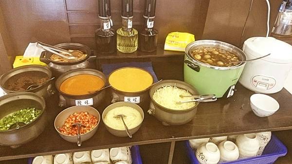 調味料區,有羊肉專屬的豆醬調味料,還有台式泡菜、肉燥和滷蛋可以拿取,白飯當然也是無限供應的。