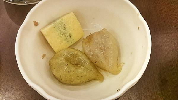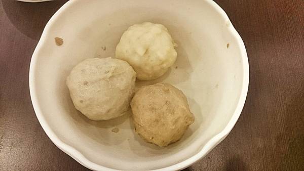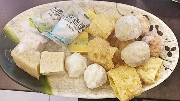 綜合火鍋料,裡面有三種顏色不同的丸子和兩種口味的水晶餃比較特別,所以我就各拿一個來嚐試看看。先說這丸子,分別是豬肉丸、蔬菜(大蒜)丸和花枝丸。豬肉丸口感紮實彈牙,鮮味十足。蔬菜丸我是不太確定是什麼種類,但玲妹說有吃到大蒜,所以就統稱叫蔬菜丸算了,味道算是清淡,可是口感一樣Q彈。最後花枝丸能吃到花枝丁,只是口感沒前兩種這麼軟彈。至於水晶餃則分為原味和九層塔味,兩種口感極度軟Q,肉餡則是泥狀的。而九層塔的也是同樣狀況,差別在於帶點香氣,但都不是我喜歡的口感,包括那黃色的火鍋料。