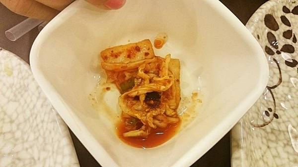 肉燥飯和泡菜,肉燥肥瘦各半,瘦肉略柴,沒有鹹香味且白飯今天有點軟爛,不是我的愛好。而泡菜屬於台式做法,口味不酸辣,有些微的蒜味存在,沾醬則是吃羊肉爐常見的豆腐乳醬料。
