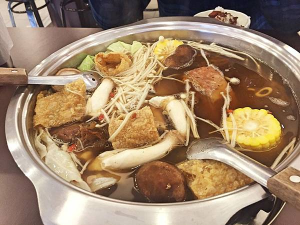 羊肉鍋,店家湯頭有放中藥材下去熬煮,但沒什麼中藥味存在,喝起來很清爽,且處於一開始沒煮的狀態下,非常適合各種食材去釋放該有的鮮度。另外要加湯的話,就要到肉品區旁邊自行拿取湯壺了。