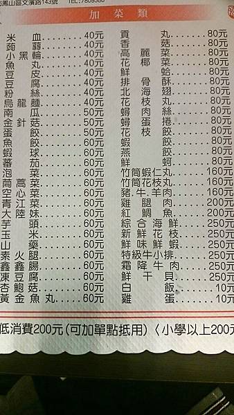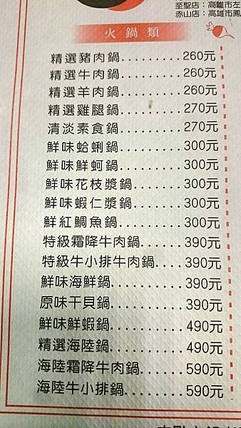 進入店內後店員會引導客人入座,菜單就在桌上,鍋類選擇性不少,單點價格頗高,想加點個肉都會讓人猶豫很久,另外店內有低消的規定,在菜單上面有標示清楚。