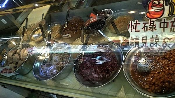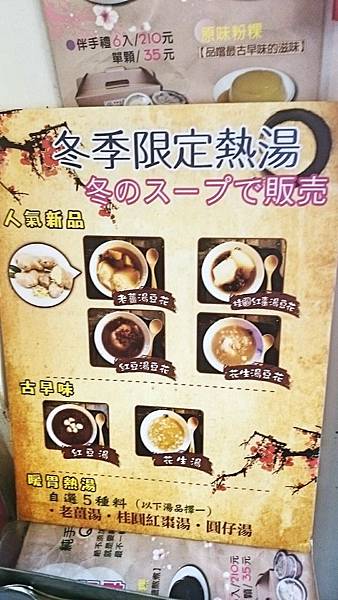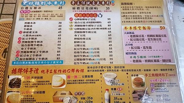 店家除了招牌豆花之外,黑砂糖剉冰也是不錯的選擇,林林總總販賣品項不少且豆花還能宅配,還有冬季限定的熱品和手工豆漿可以買,真的是應有盡有。而綜合豆花的配料可以選擇四種,就在一旁櫃子裡任君挑選。
