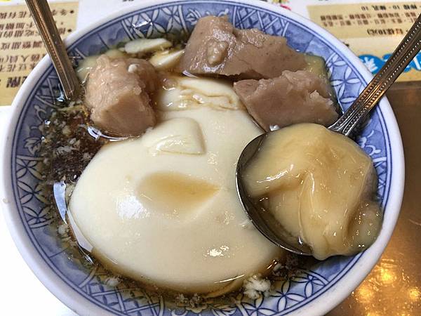 扁擔豆花(原味),我搭配兩種料,多加了20元,主要因為不想吃太多就沒點綜合豆花。而豆花本身是古早味綿密口感,糖水很甜,還好豆花的份量給不少,糖水甜度就被拉低了,達到一種平衡的效果。配料則選了芋頭和豆漿粉粿,芋頭口感軟爛,有把甜度熬煮進去,不錯吃。豆漿粉粿非常特別,至少我第一次聽到,顏色偏土黃,口感竟是軟黏的,原本以為很軟Q,有讓我意外到。