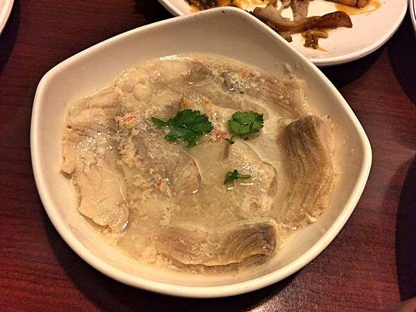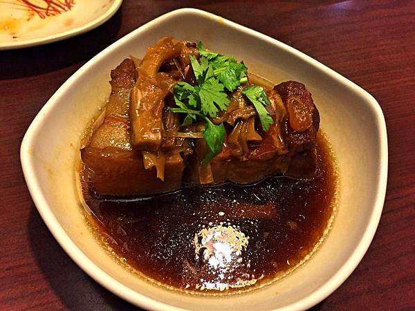 豬腳蹄膀切片,這道菜我們點了兩次,因為調味太特別了,鹹甜之外還有稠感且店家放了不知名的香料下去調味,嚐起來頗為另類。蹄膀切片就更加不用說了,軟嫩鮮美,要不是吃到後來很飽,不然還想加點白飯來配。