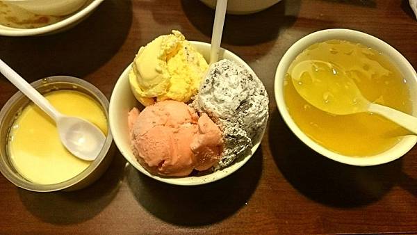 焦糖布丁、檸檬愛玉和小美冰淇淋,每次吃完吃到飽的一定要有冰品當作最後Ending。焦糖布丁和愛玉(今日甜品)是菜單上所點選,布丁有焦糖香味且滑嫩可口,還蠻好吃的。愛玉的酸甜人工味比較重一點,我不太喜歡,冰淇淋就普通,好處是多量又好挖。