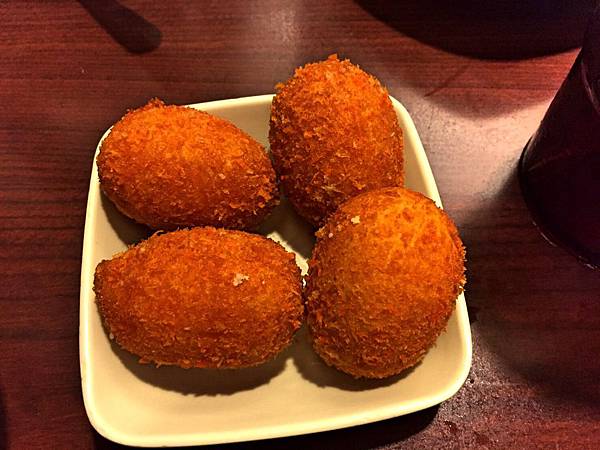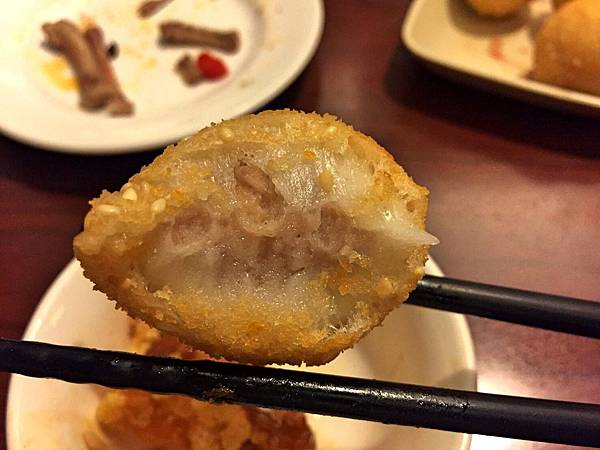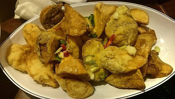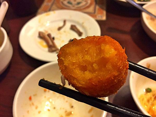 酥炸芋丸、南瓜球和炸銀絲卷,吃到最後當然要來點甜菜了。芋丸和南瓜球外表有酥度,芋丸內餡多了麻糬,南瓜球則是滿滿的南瓜泥,且口味都不是很甜。而銀絲卷頗為鬆軟加上香甜的煉乳,不禁得讓人胃口大開起來,雖然已經飽到天靈蓋了,但還是三兩下就把它吃完啦。