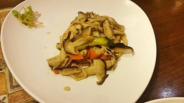 涼拌野菇和椒鹽杏鮑菇,涼拌野菇口味帶點酸甜度,杏鮑菇則是炸的外皮酥脆,但有點回軟,剛上桌時最好吃,份量也不少,可惜容易有飽足感。