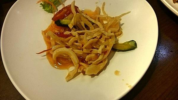 三杯魷魚和泰式花枝,三杯味道微苦略鹹,魷魚口感軟韌Q彈,九層塔香氣摻雜其中。花枝則是酸甜滋味,咬起來沒什麼特點,很普通。