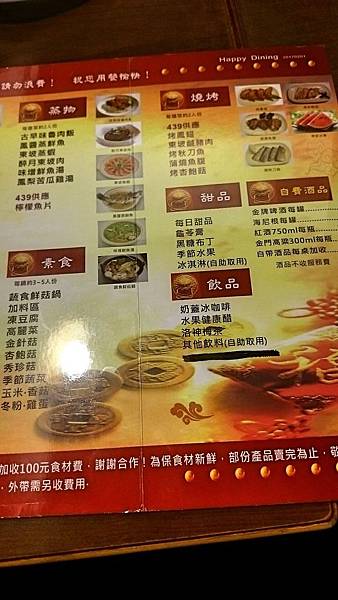 餐廳門口有一本大菜單可供想消費客人參考,上頭就有清楚標示著價位和2小時用餐時間的規定。而菜單飲品區上三種飲料每人現點一杯,其他就由現場的飲料區供應。甜品區的話就無限點選,且店家會一直強調不怕客人點但怕浪費而已。另外上菜速度很快,有可能因為我們平日晚上來的關係吧。