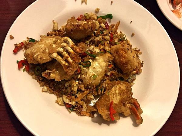 蒲燒魚腹和椒鹽蟹身,魚腹是坊間賣的蒲燒鯛魚,就加熱後上桌即可的便利品,鹹甜度甚高。蟹身用大量的蒜酥來提味,肉質不鬆軟,水準沒有偏差太遠。