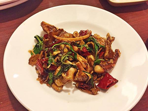花雕雞、山寨口水雞和椒麻雞,花雕雞店家作法偏向宮保,微鹹帶點酒香,雞肉口感軟實。口水雞則沒什麼突出味道且不會辣,和我吃過的相差甚遠,難怪菜名會取作山寨口水雞。椒麻雞的話,店家使用了甜雞醬當調味基底,當然跟椒麻扯不上邊,底盤則是放了洋蔥,雞肉外皮很酥脆,肉質紮實且份量也多,還算可以。
