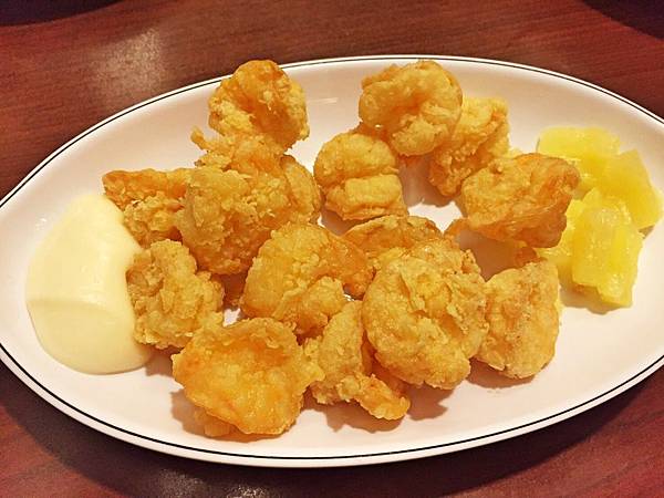 鳳梨蝦球,這盤我們點了三次,店家蝦球不是拌炒在一起的而是各自分開。蝦球有酥脆感,蝦肉普通,粉裹得不算厚,但大姐們很喜歡吃,一旁的罐頭鳳梨和沙拉醬就各自口味去沾取了。