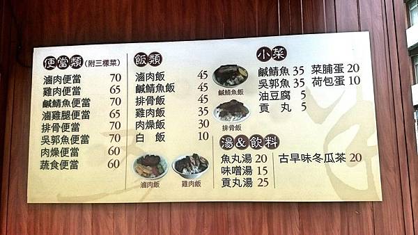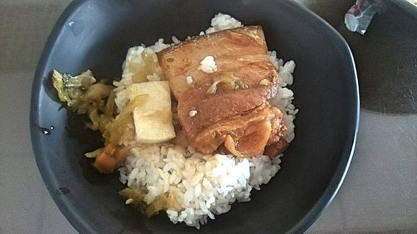 滷肉飯,我沒有選擇便當類的,所以基本配菜是酸菜和一塊醃蘿蔔,醃蘿蔔味道不怎麼討喜就略過不提了。白飯上有淋了肉燥,吃起來頗為鹹香,肉燥則以肥肉居多,但完全不膩口,看來店家的肉燥飯也是可以期待的。而主角滷肉外觀看起來油亮光滑,尤其那肥肉部分更是入口即化,整個不油不膩,滷汁鹹度有入味。然後瘦肉口感軟實鮮嫩,肉質絲絲分明,還蠻好吃的。