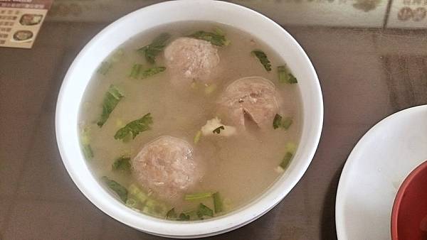 貢丸湯,湯頭呈現混濁的狀態,且店家放了不少冬菜在裡面,看來是有特別熬煮過的,喝起來鮮甜清爽。貢丸的話,口感緊實,彈牙度普通,沒有特別之處。