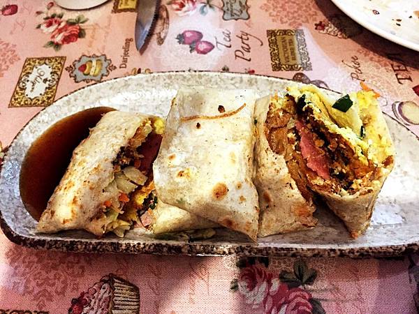 招牌蛋餅,這裡頭包了碎油條、生菜和火腿,蛋餅皮是一般坊間在賣的,口感厚實有咬勁。而內餡包了不少東西,所以吃起來感覺很豐盛,可惜油條沒有很脆,但整體表現中規中矩。