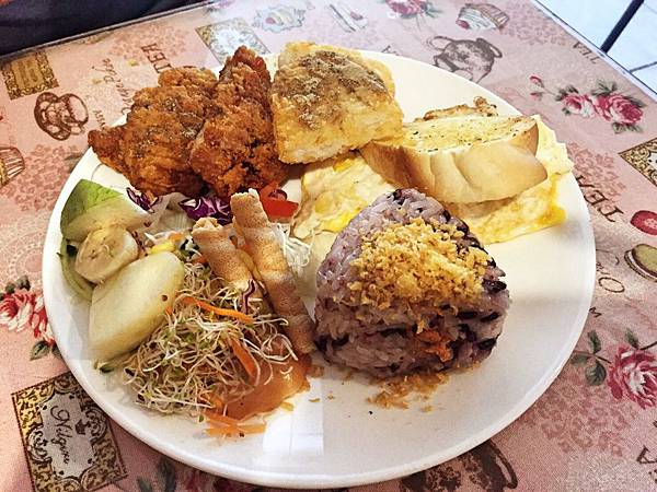 卡啦餐,比美式燒肉那盤多了紫米飯糰、卡啦雞腿排和薯餅,其餘都是相同的東西,我就不多做說明了。其中紫米飯糰飯粒很黏實,整個都團結在一起,口感不怎麼好吃。卡啦雞腿的話,外皮酥脆,但有炸過頭的嫌疑,口感偏硬且雞腿肉水分略為流失,沒有雞汁殘留,有點可惜。而薯餅就吃起來很普通,但吃完這盤還是很有飽足感的。