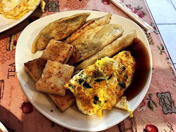 中華拼盤,有蘿蔔糕、煎餃和蔥蛋,這盤除了蔥蛋的蔥花味道很香之外,其餘兩種頗為普通的,沒什麼出奇之處。煎餃的酥度很薄弱,肉餡韭菜味有點重,整個口感不太合我胃口,唯一優點就是可以用便宜價格就填飽肚子了。