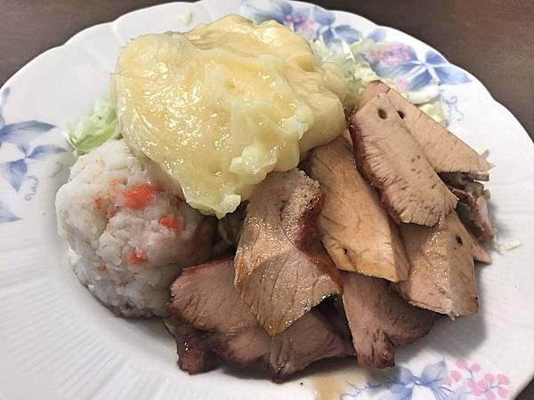 烤肉沙拉,店家給了不少塊的烤肉片和大量的生菜絲、沙拉醬以及一球馬鈴薯沙拉。生菜絲有蔬菜生味,需要靠沙拉醬的協助,而馬鈴薯沙拉口感綿密。最後烤肉軟嫩不柴有嚼勁,吃的到塗抹在上頭的鹹甜醬料和烤過的香氣,不愧是店家招牌,可惜價格略高。