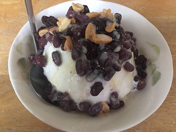 綜合蜜豆冰,一碗50元算是有點貴,配料就給紅豆、花生和葡萄乾,然後在香綿冰上頭淋了不少煉乳。紅豆吃起來挺熟爛,但是有顆粒感,還不錯,花生就是硬口的顆粒,葡萄乾可以略過不提,其實用料很簡單,也不錯吃,只是價格是一大缺失。