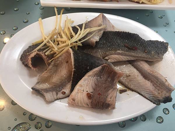 魯虱目魚皮,魚皮店家沒有切斷,所以請自行使用筷子切開吧。皮下魚肉較少,沒有厚實感,且滷汁味道不重,要靠沾醬的支援才會夠味。