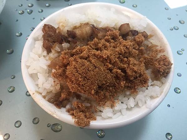 魚酥肉燥飯(小),肉燥以肥肉居多,但不膩口,而魚酥遇到口水後有點黏性,加強了飯的鹹甜味道,讓整個肉燥飯的美味程度提升許多。