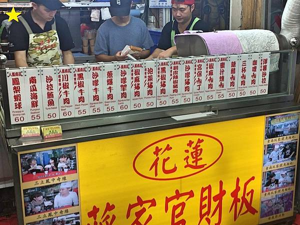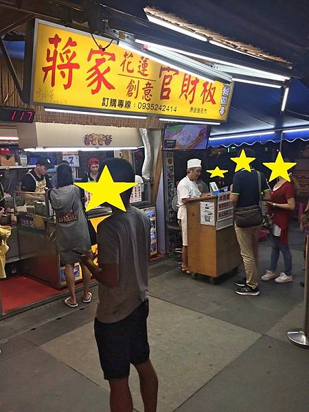 邊走邊喝完飲料後,想說沒有東西來填飽肚子這樣也不行,就看到這一間蔣家花蓮創意官財板的排隊盛況,我們禁不起誘惑就加入了排隊陣容,還好店家位置夠多,點餐速度也很快,不一會兒就順利入座囉。