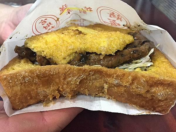 黑椒牛肉,外層厚片吐司炸過之後含油量不多,但沒什麼甜味,只有鹹度。然後黑胡椒調味頗重,所有味道都被黑胡椒給主導了,且牛肉挺有嚼感的。而配菜則是給了高麗菜絲,整體來說還好而已。