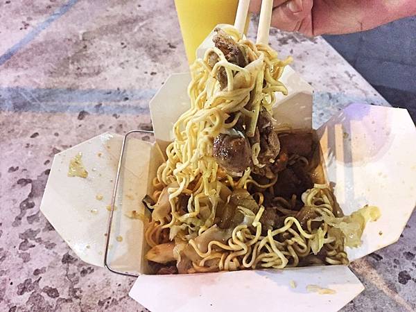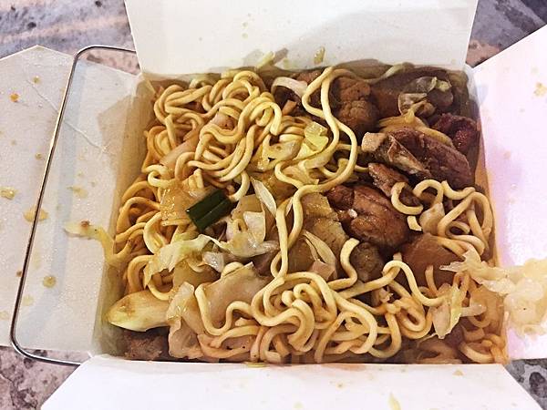 豬豬炒泡麵(原味),這份一百,看起來和價格不符,但其實盒子很深的,我們兩個人吃也覺得份量超多,且不管麵條或者山豬肉片同樣都很大方地再給,確實對得起店家開立的價格。而這麵條是使用拉麵款,並不是像統一肉燥麵或維力炸醬麵的泡麵,麵條偏粗,但能吸附醬汁的能力很低,還是傳統泡麵比較好吃。另外泡麵調味就是鹹香味道,還放了高麗菜和洋蔥來增加口感。至於山豬肉片,是有帶肥油的三層肉片,肥肉部分咬起來頗為軟Q,瘦肉則是富有嚼勁,出乎預料之外的好吃,整體來講算是還不錯,想填飽肚子點這個準沒錯。
