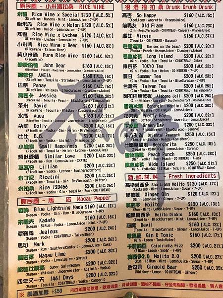米香,名字很一般,且還跟我家的瑪爾濟斯撞名,但衝著它是銷售排行榜的第一名就點來喝看看。一入口就有小米酒的味道,但整個偏甜,完完全全就是女性愛喝的調酒風味,然後酒精濃度也不高,還帶點薄荷味道,只是加在裡面的薄荷葉蠻礙口的,因為喝到最後都會不小心吃到葉子。另外看了一下成分,這調酒是小米酒、香蕉、薄荷和檸檬汁所組成的,難怪會這麼受人喜愛。