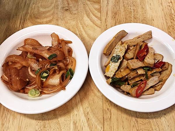 豬耳朵和豆干,豬耳朵些微脆口,鹹鹹甜甜的還不錯吃。而豆干氣孔不少,有吸附了少許醬汁進去,同樣吃起來也是鹹甜滋味。然後辣椒看似放很多,但一點也不辣,好吃。