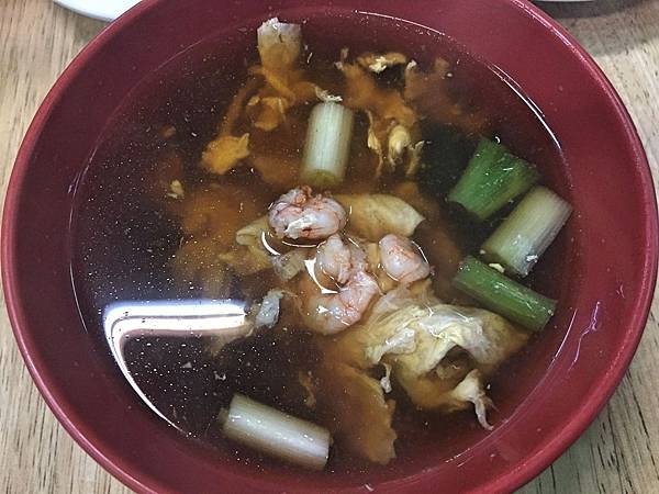 蝦仁鴨蛋湯,這碗湯裡面有蝦仁數隻和鴨散蛋,兩種食材只是陪襯,重點在湯頭。喝起來頗為清甜,是醬油風味的高湯,甜而不膩的特質讓我停不下手,蠻好喝的,不少人桌上都會來個一碗。