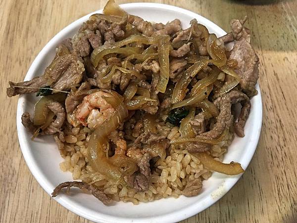 蝦仁肉絲飯,首先飯粒頗為濕潤,幾近熟爛的效果,然後甜鹹醬汁的滋味很突出。而蝦仁給了幾隻,沒有肉絲這麼的澎湃,甚至店家還把肉絲和洋蔥一起炒過才加上去的,讓肉絲味道和香氣更上層樓,只是我不太喜歡飯粒的口感,不然肉絲軟嫩有咬勁的特點還蠻吸引人。