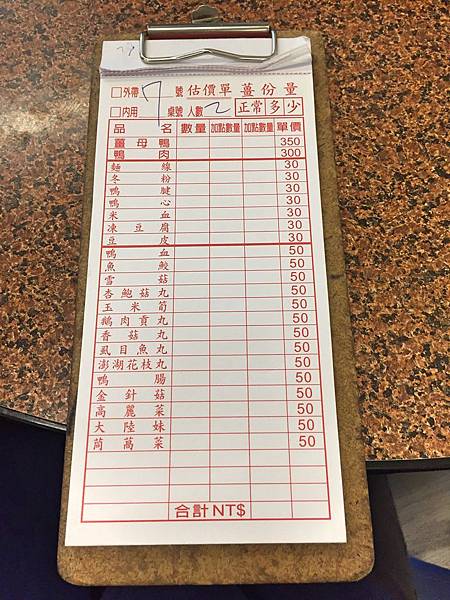 入座後店員會送上菜單,菜色就和一般薑母鴨店沒兩樣,只是這間丸子類的配料比較多。