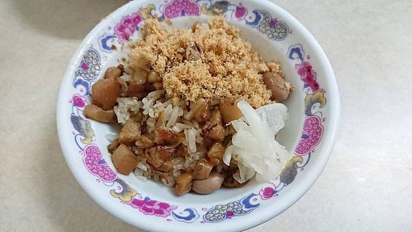 香菇肉飯(小),配料就香菇、豬肉和醃漬薑片跟蘿蔔片,調味鹹度剛好,吃起來有油脂的香氣發散出來,很特別的味道。另外香菇頗鹹,豬肉有點乾柴,不是我喜歡的咬勁,但這碗的調味有點讓我著迷。