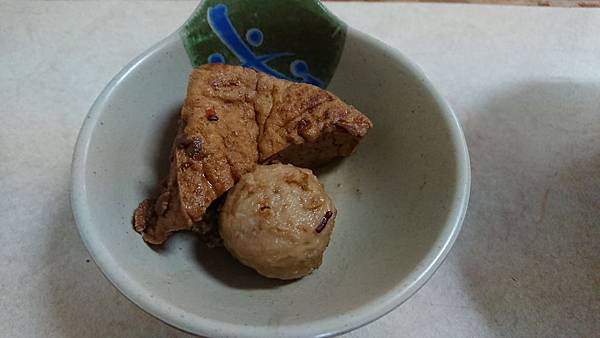 油豆腐和魯貢丸,油豆腐非常入味,裡面氣穴很多,但有點偏鹹,適合搭配飯類一起食用,而魯貢丸則是口感微Q彈。