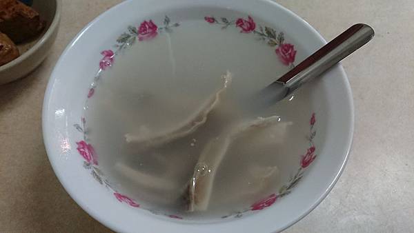 豬肚湯,豬肚給的不多,口感軟中帶脆。而湯頭是四神基底,但是略為清淡,沒有濃厚的中藥氣息,也無乳白色的溫和四神味,表現很普通。