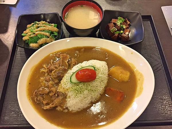 咖哩牛五花定食,選擇定食的話有附味增湯和兩樣小菜,其中龍鬚菜醬汁是胡麻醬,吃起來偏甜,而小豆干略鹹一點,至於味增湯則是鹹甜合宜,還放了少許豆腐和海帶芽。然後咖哩份量頗多,白飯也給不少,幾乎每口白飯都能搭配到咖哩醬汁。且這咖哩口味鹹中帶甜,濃稠感普通,吃起來有點順口,算還不錯。最後牛五花肉店家烹煮的有點老,口感稍差一點,可惜了。