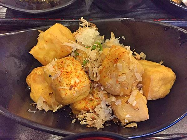 雪山豆腐,豆腐外層裹粉挺薄的,所以口感微酥。而豆腐本體沒什麼味道,需要淋醬的加持才會變得好吃,整體來說很普通。