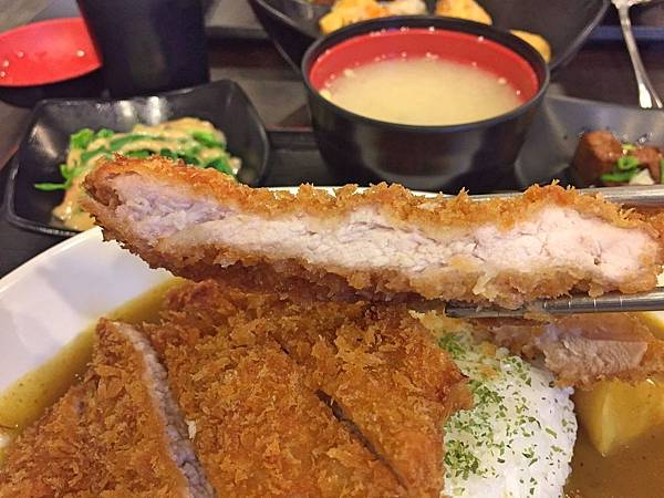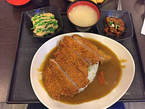 咖哩豬排定食,配菜和湯品都跟牛五花的一樣,我就不加以敘述了。然後豬排非常厚實且蠻大一塊,外層炸粉頗為酥脆,但唯一缺失的是肉質太過紮實,沒有軟嫩感的存在,可能因為少了肉汁的滋潤,讓這豬排咬起來有點乾,算是美中不足的地方。