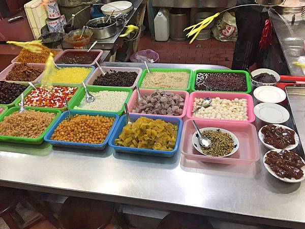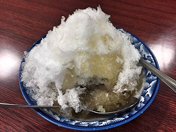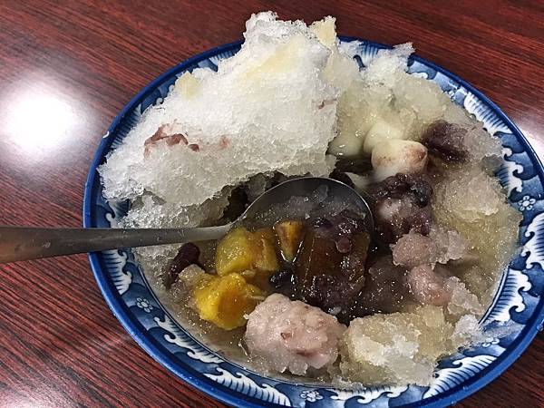 八寶冰,雖然名稱是八寶但只能選擇6種料,且料還可以重複點。首先冰體非常細緻,沒有冰塊感,嘴巴一抿就會化開,另外店家糖水淋得很恰當,這點還不錯。而餡料我們選了芋頭、蜜地瓜、湯圓和紅豆粉粿,其中芋頭和蜜地瓜口感軟綿扎實,湯圓則是口感有點硬Q,不太討喜,最後紅豆粉粿軟黏略彈,我喜歡這種咬勁。