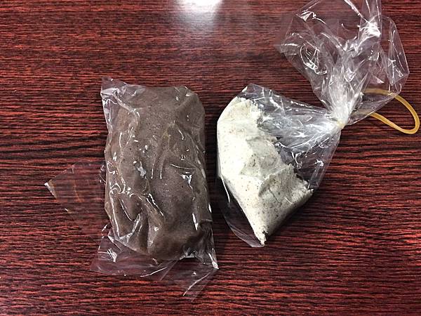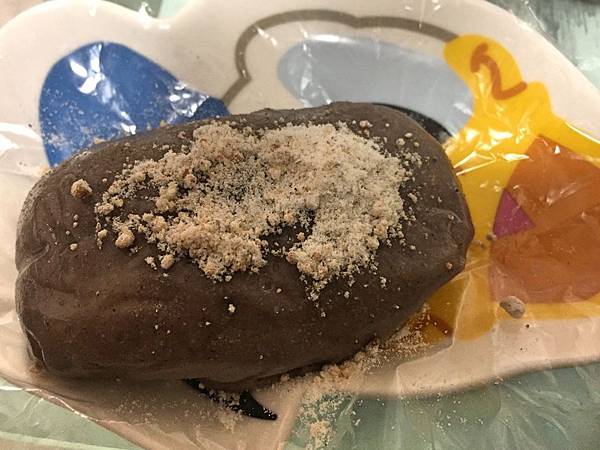 招牌麻糬,麻糬外帶店家會多附一包花生糖粉。然後外皮只剩紫米口味,咬起來口感非常軟Q黏滑,拿在手裡都會黏在手指上,有點浮誇的黏。而裡面包了綠豆餡和花生糖粉,鹹甜相襯,這樣吃就很美味了。