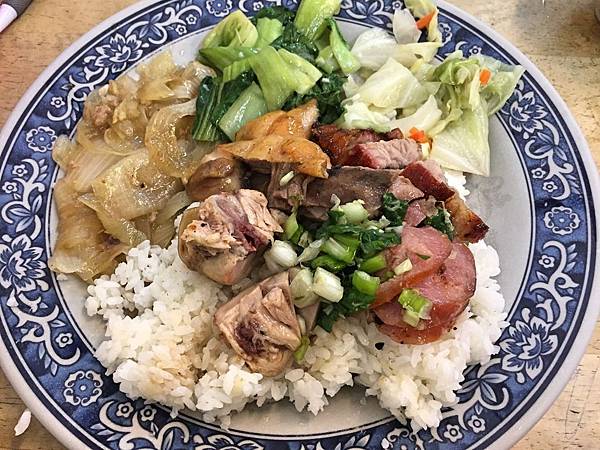 油雞飯,這盤另外加了50元的火肉,且蔥油因為只單點了一樣主食油雞,所以給的量特多,整個吃起來油滑鹹香,然後油雞軟嫩口感無庸置疑。而火肉頗為厚實,肥皮部分酥脆度高,吃起來完全不膩口,難怪不少客人都會加點火肉來享用。