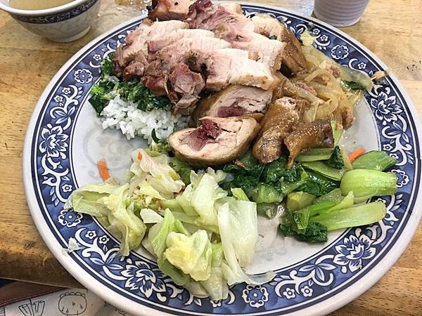 四寶飯,這邊四寶指的是香腸、油雞、燒鴨和叉燒,另外還給了三樣配菜,但滋味沒有搭配油雞的蔥油來得吸引人。而香腸和燒鴨很普通,油雞則是挺軟嫩的。最後叉燒口感軟實,帶點甜甜的味道,且重點是搭配油雞的鹹蔥油,蔥味非常之濃厚,也頗為下飯,讓整盤飯變得好吃許多。