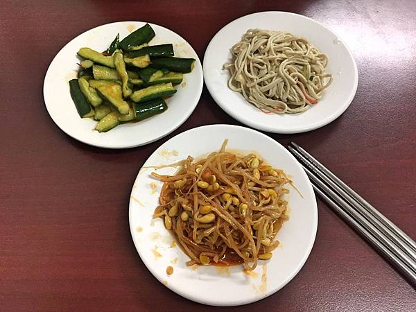 涼拌小黃瓜、白玉豆干絲和辣炒黃豆芽,小黃瓜清涼酸甜又脆口,還可以。而豆干絲口感非常軟,沒有咬勁,不太喜歡。最後黃豆芽很像使用韓式辣醬下去拌炒,甜辣滋味使人過癮。