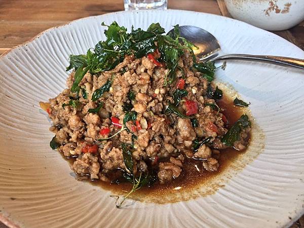 泰式打拋豬,我們選了小辣的辣度,但這樣就已經很辣口了,而整體調味很下飯,但沒有打拋醬的香氣,不怎麼夠味,僅有辣度撐撐場面。