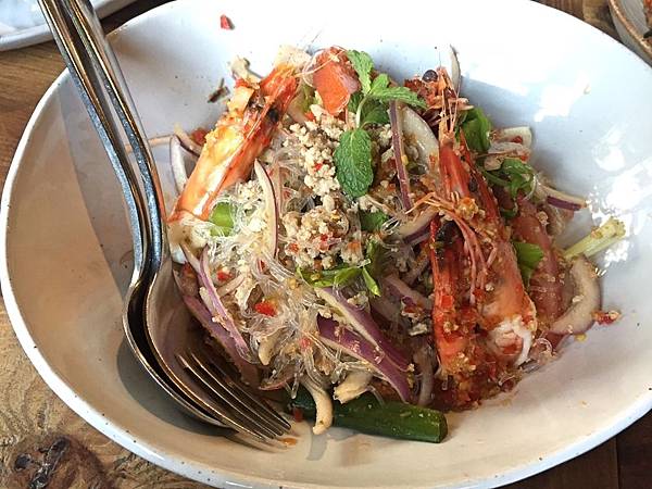 海鮮粉絲涼拌,雖然菜名有著海鮮二字,卻給了蝦子兩隻而已,沒看到透抽或蛤蠣之類的,有點寒酸的感覺。且其中紫洋蔥是最多的,稍微嗆辣,然後調味同樣是酸甜風,只是唯一的蝦子肉質還不夠緊實,蠻失敗的一道料理,僅有的可取之處是冬粉口感富有咬勁。